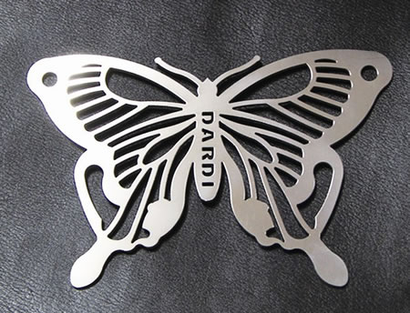 在生活中我們常見的一些漂亮的金屬制品,知道是怎么做出來的嗎?當然是通過我們的激光切割機的‘手藝‘了。它可以在平面切割板材切割任意圖形,切割多元化,也可以切割管材與其他異性材料,這就造就了我們激光切割機的神奇之處了。而且它可以對鋼板,不銹鋼、鋁合金板、硬質合金等任何硬度的材質進行無變形切割。下面這個漂亮的蝴蝶就是激光切割機做出來的了。